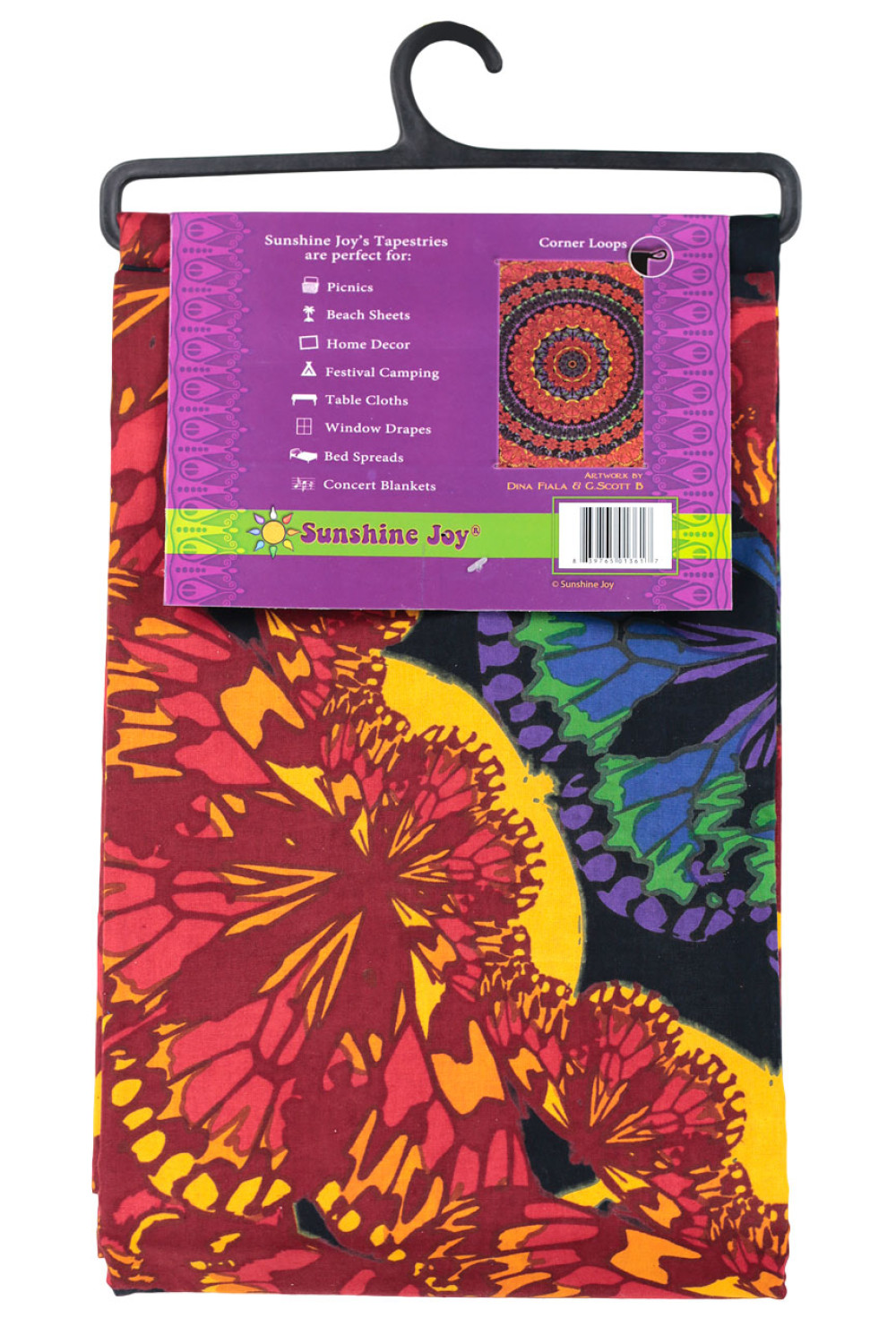 3-D Tapestry - Artwork appears to float of the fabricwhen viewed through special Sunshine Joy 3D glasses (sold separately). You stare at your new SunshineJoy tapestry intently as it hangs on your wall. You marvel atits intricate and well-crafted design and love the beauty it brings toyour environment. The colors and artwork are inspiring. One would neverexpect anything more from this printed fabric, but then, you breakout Sunshine Joy’s 3-D Glasses and WOW. Youhave gone deep down through the rabbit hole and into another dimension. Itappears that you can get your hands behind the colors, and it’s funwatching your friends do just that.