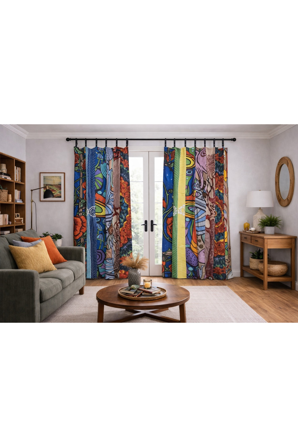 Sized approximately 56.5 inches wide by 85 inches tall, with sturdy top tabs for easy hanging. Ideal for use as window curtains, door coverings, sliding glass door panels, or even a boho shower curtain (liner recommended). Elevate any room with vibrant patchwork vibes and artisan energy!