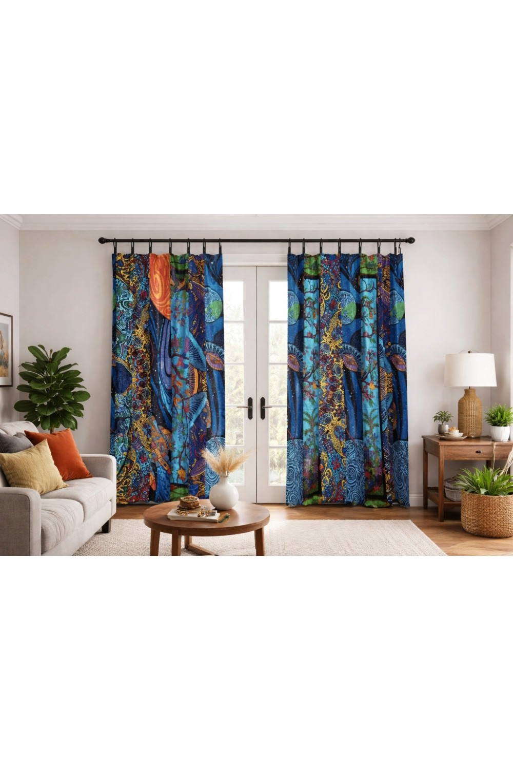 Sized approximately 56.5 inches wide by 85 inches tall, with sturdy top tabs for easy hanging. Ideal for use as window curtains, door coverings, sliding glass door panels, or even a boho shower curtain (liner recommended). Elevate any room with vibrant patchwork vibes and artisan energy!