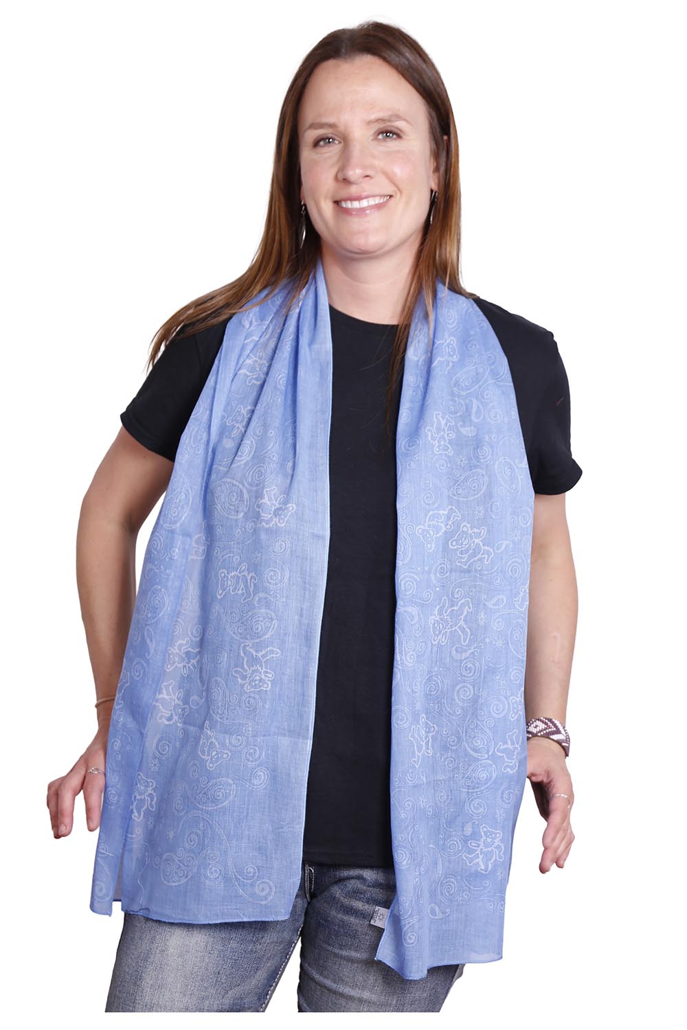 Spin the wheel and let your style dance — this Grateful Dead scarf is a song you can wear. Blue as a dream and rich with paisley swirls, it features the legendary Dancing Bears stepping in rhythm across a sea of swirling cotton skies. Lightweight, semi-sheer, and steeped in Deadhead tradition, it’s made for wanderers, poets, and anyone who walks with music in their heart.