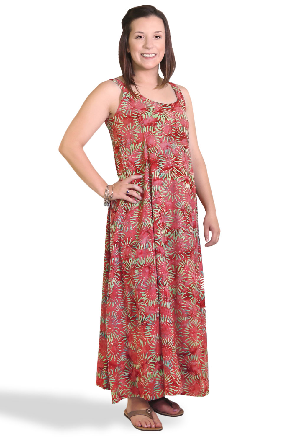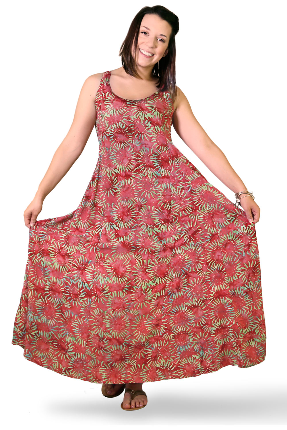 Hary Dary Long Strap Dress Red with Sunflowers. These super soft and colorful batik dresses are a great addition to any wardrobe. Perfect for the beach or a night on the town. Hary Dary is a leading name in batik clothing from Bali. Available in sizes Small through XL. Made from 100% #1 Rayon. The highest quality rayon available. Made in Indonesia.