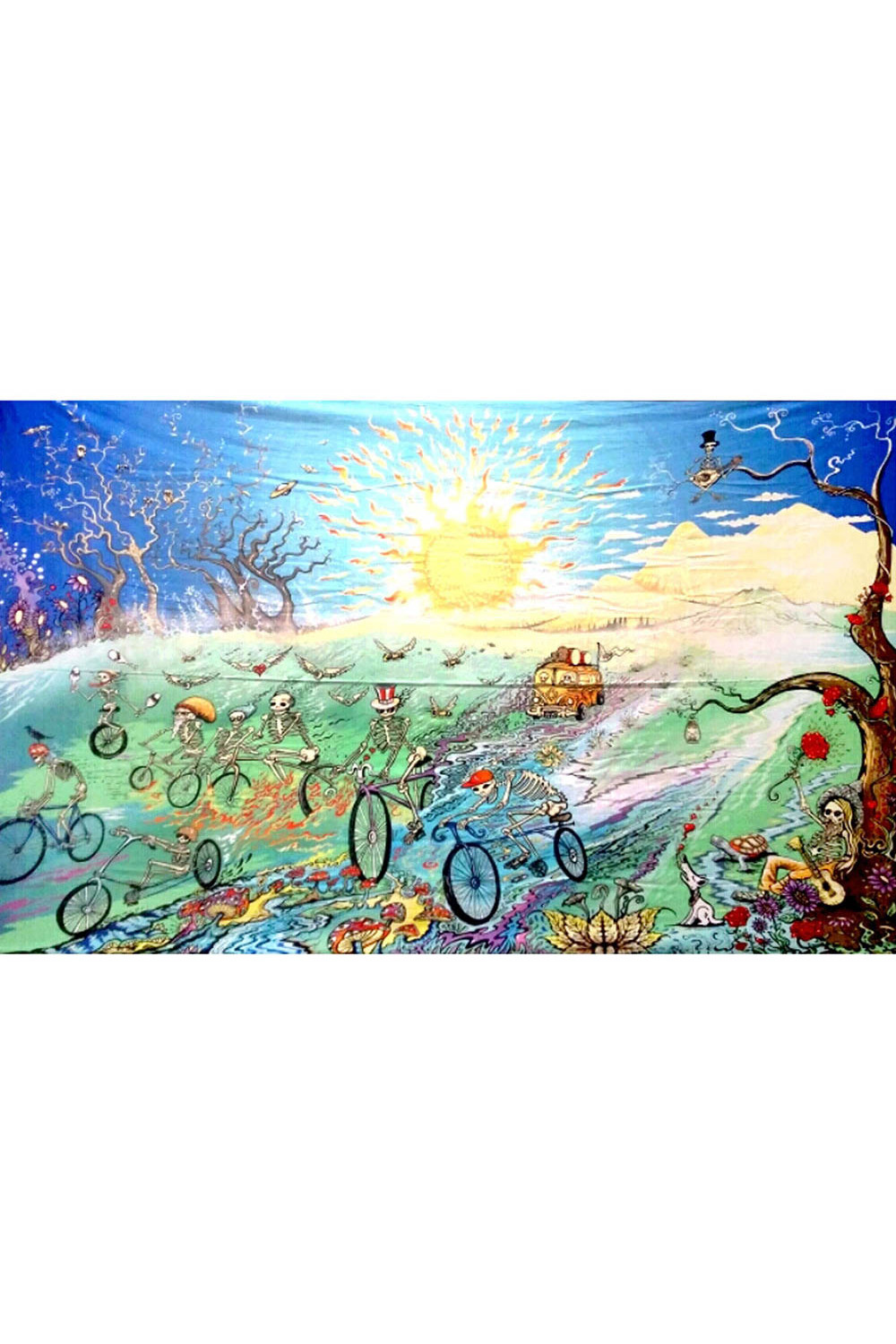 Skeletons on Bikes Heady Art Print Tapestry Artwork by Mike DuBois.Measures approximately 53 x 85 inchesHigh resolution artwork printed on high quality, 100% cotton fabric. Brought to you by our good friends at Zest For Life.These digital print tapestries incorporate the latest in high resolution digital fabric printing. These tapestries make great wall hangings and can also be used as tablecloths, beach sheets, room dividers, curtains, window treatments, ceiling decor and furniture covers. The corner loops make these tapestries the perfect multipurpose outdoor traveling companion. Secure your picnic sheet . At outdoor concerts or festivals, stake out an appropriate amount of space for your friends. Tie up a sunscreen at the campsite. Great at the beach as a windproof beach sheet or sun cover-up.Available in limited quantities.