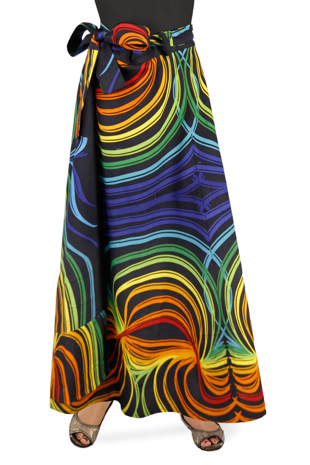 Rainbow Ripple Wrap Skirt with zippered waistline pocket. 100% cotton. Artwork by Dina June Toomey. The skirt measures approximately 38" long and 44" wide. Due to its wrap-around style, it will fit a wide range of waist sizes (36" waist maximum-approximately). Made in India using traditional methods.