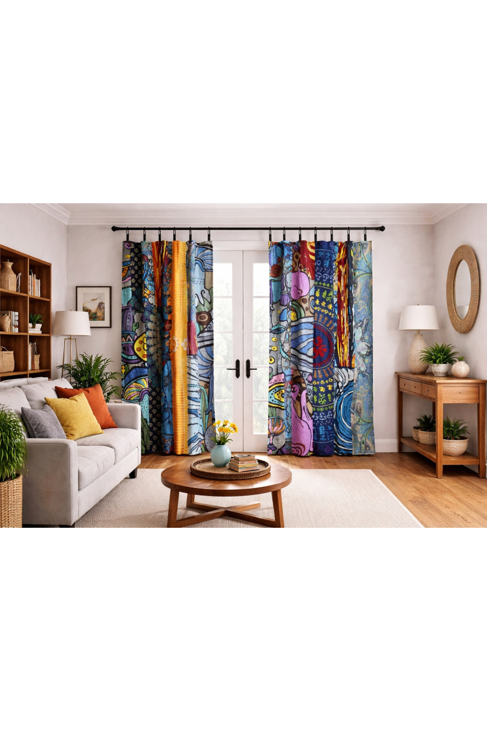 Sized approximately 56.5 inches wide by 85 inches tall, with sturdy top tabs for easy hanging. Ideal for use as window curtains, door coverings, sliding glass door panels, or even a boho shower curtain (liner recommended). Elevate any room with vibrant patchwork vibes and artisan energy!