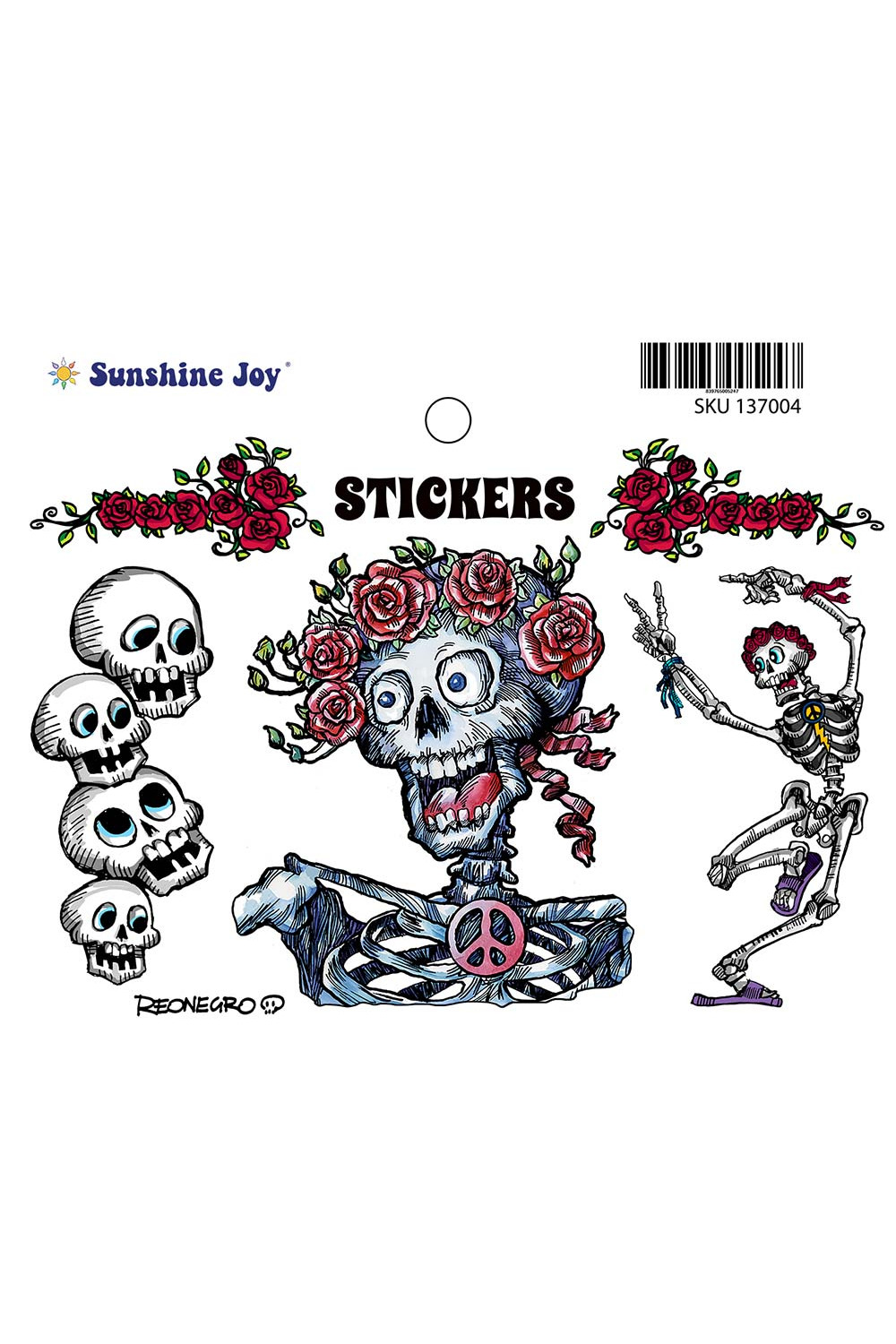 Die-cut multi-sticker featuring playful skeleton and roses imagery. This multi-sticker contains five separate peel-off stickers for your sticking enjoyment.