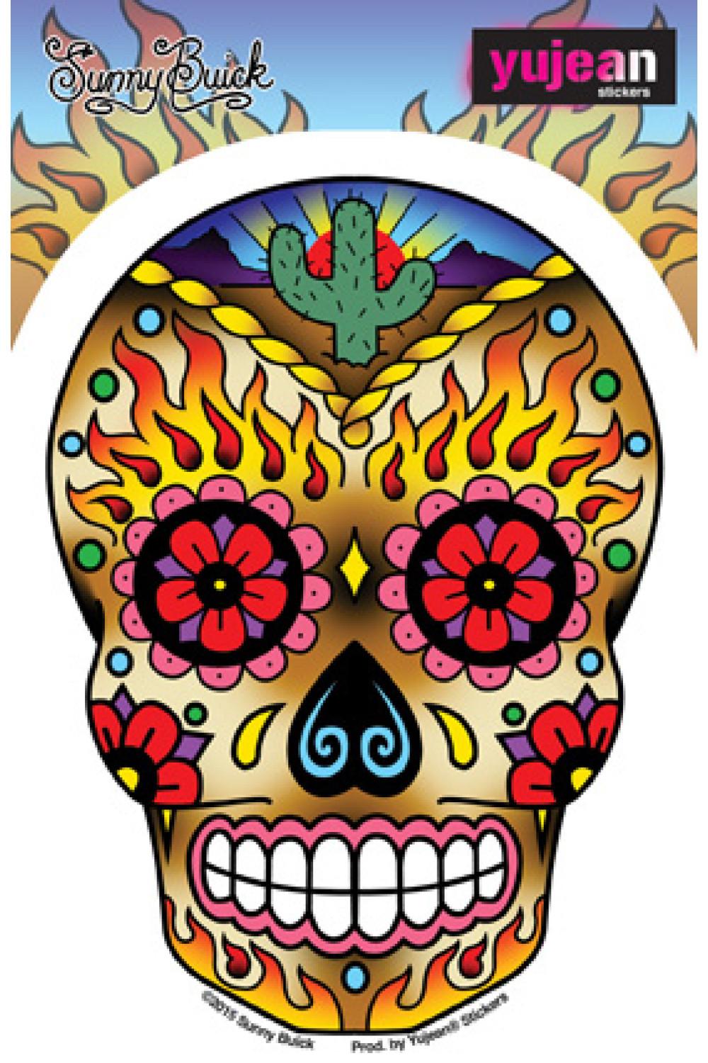Sunny Buick Cactus Flame Sugar Skull Sticker.Measures 5 x 4 inches.