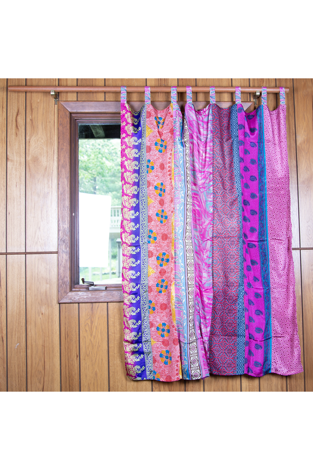 Lightweight and colorful, our single-panel curtains are made from re-purposed vintage sari fabric and come in a variety of colors and patterns. Each one is unique.