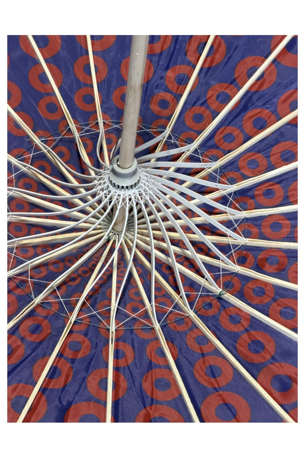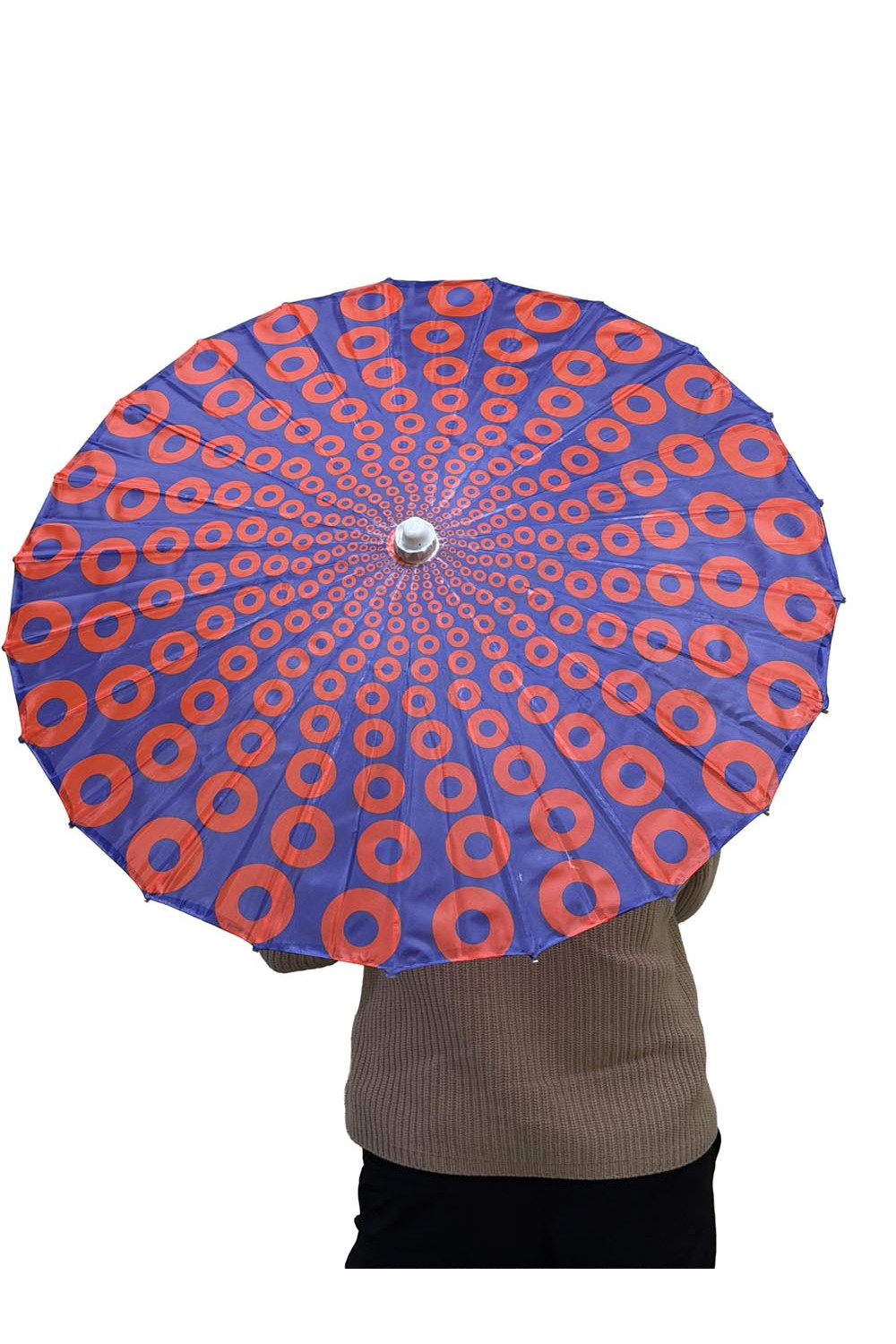 These parasols are popular for music festivals, beach days, outdoor markets, garden parties, and summer events. Easy to carry and easy to spot in a crowd, they are both a functional sun shade and a moving piece of art. Great for twirling.