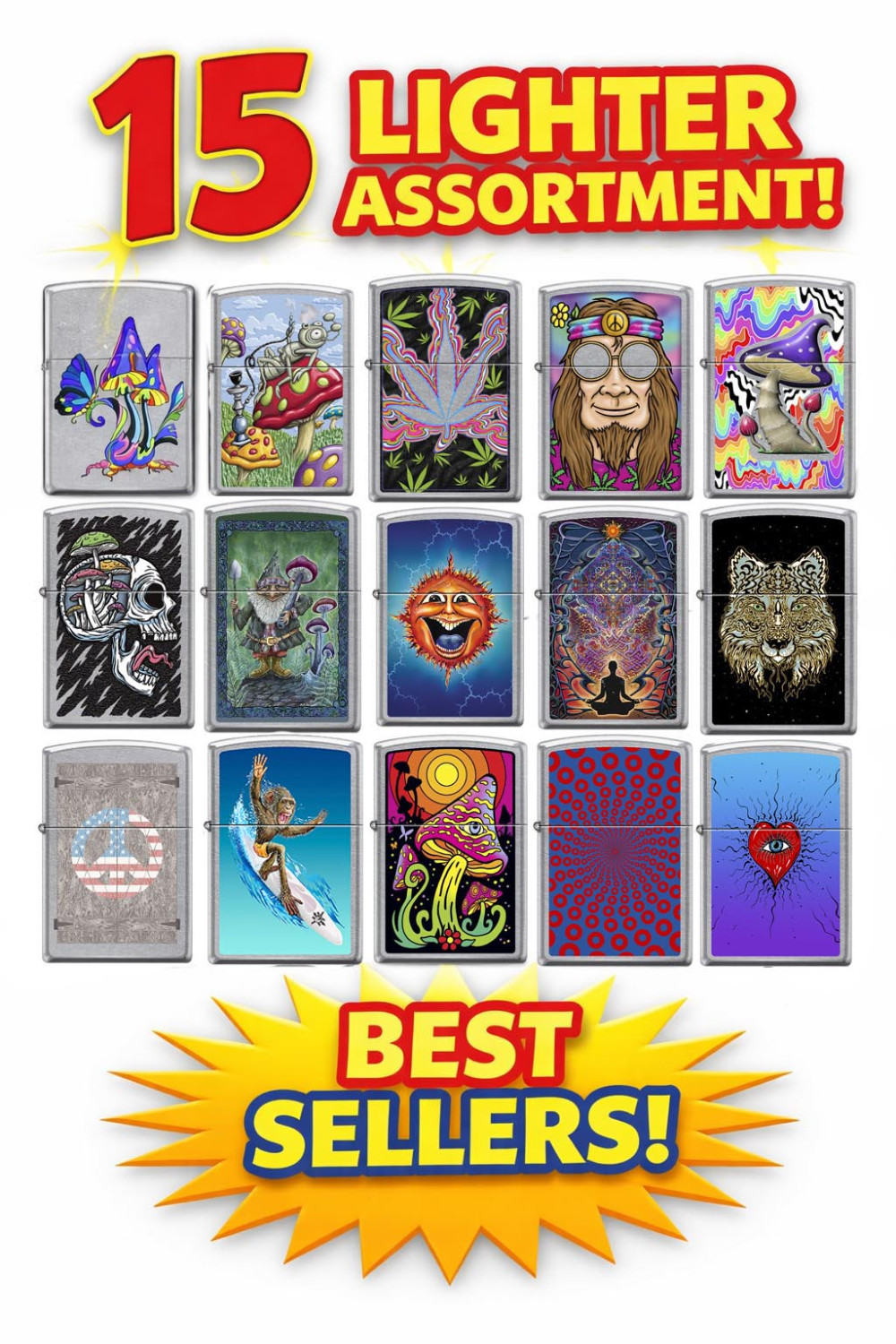 15 Piece Zippo assortment. Each lighter in the assortment has an MSRP of $31.95 to 34.95