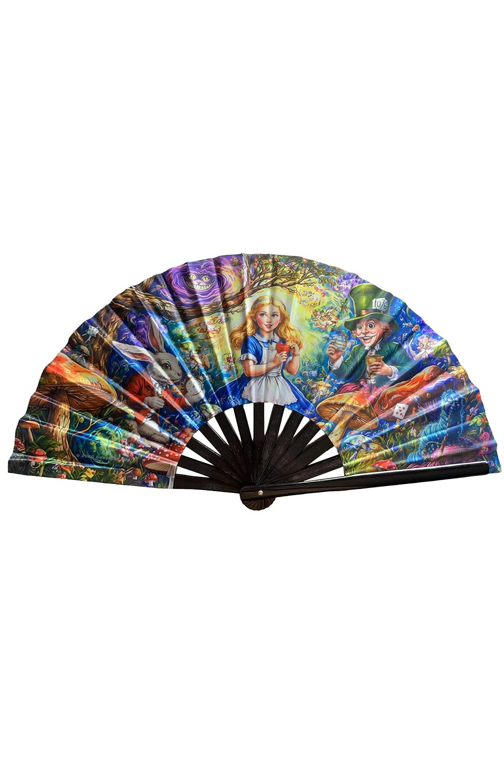 Step into a surreal storybook world with this Alice in Wonderland clacker dance fan. Featuring richly detailed artwork inspired by the classic tale, this folding fan blends fantasy visuals with high-energy function for festivals, concerts, and dance events.