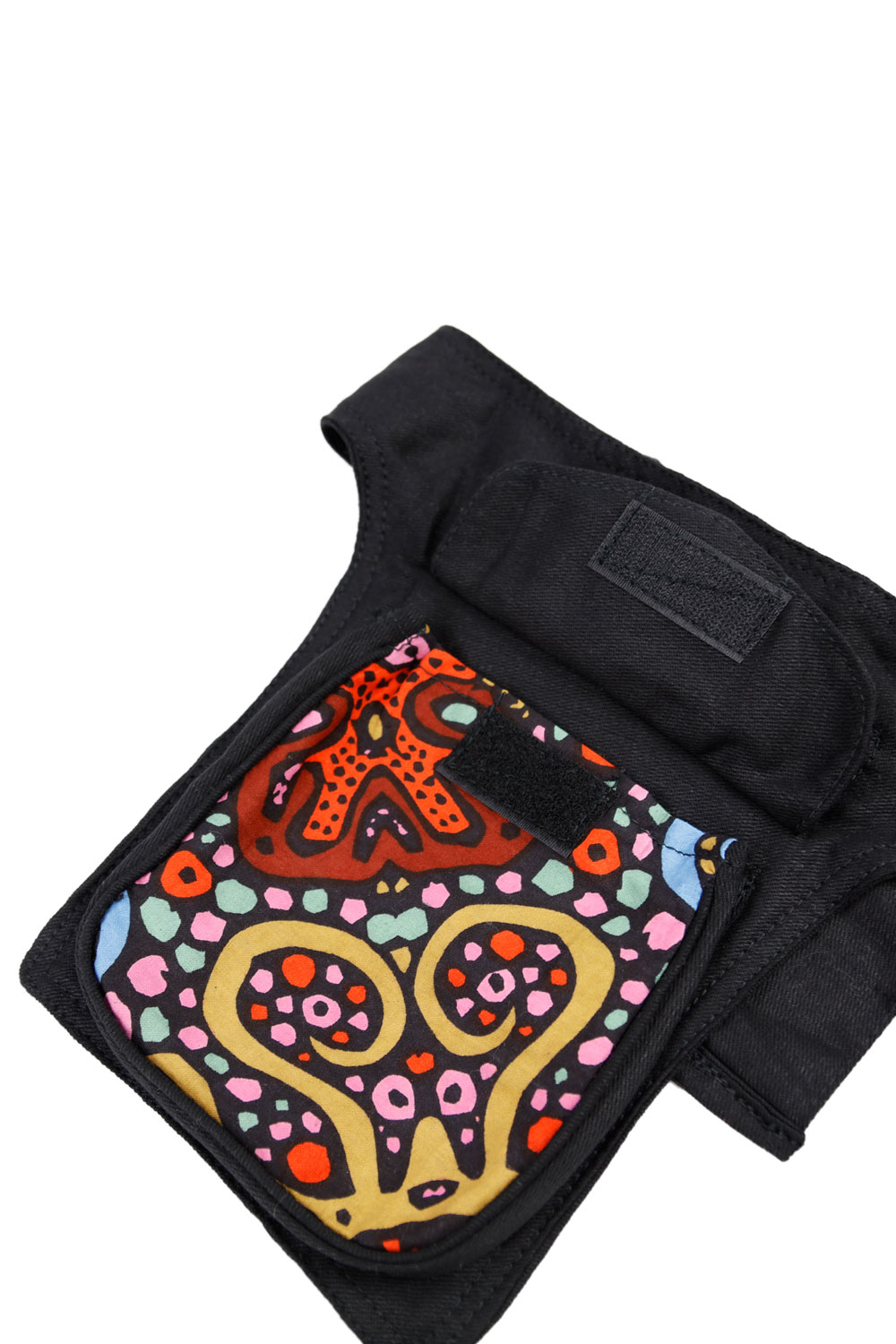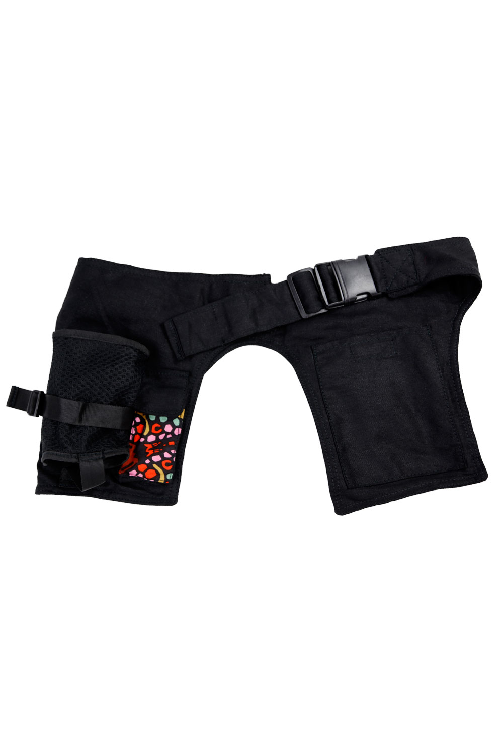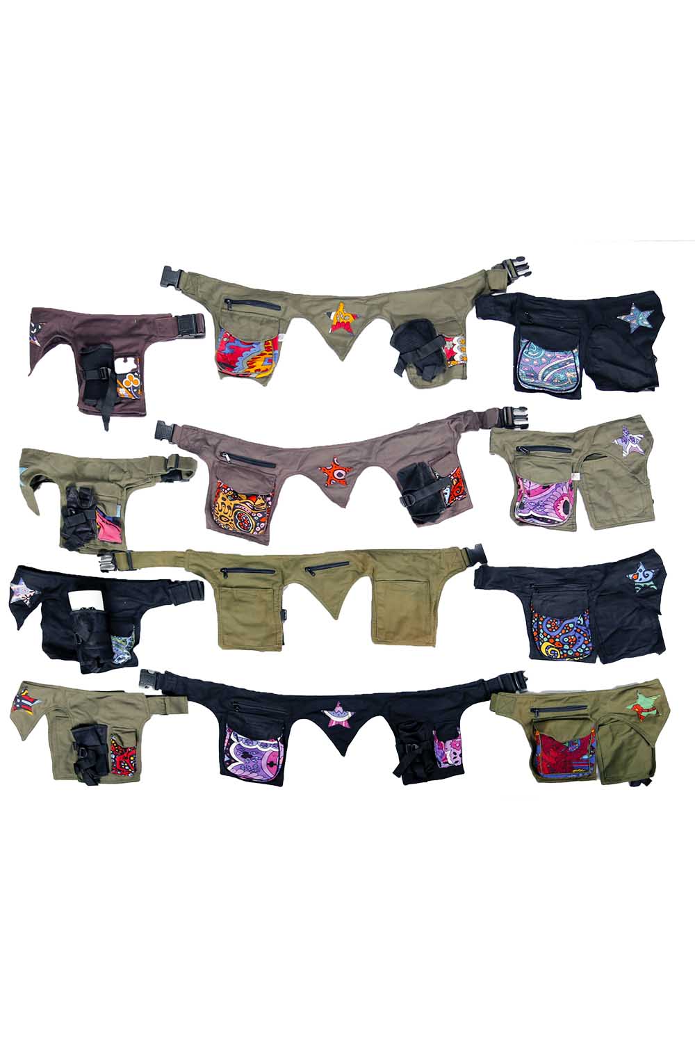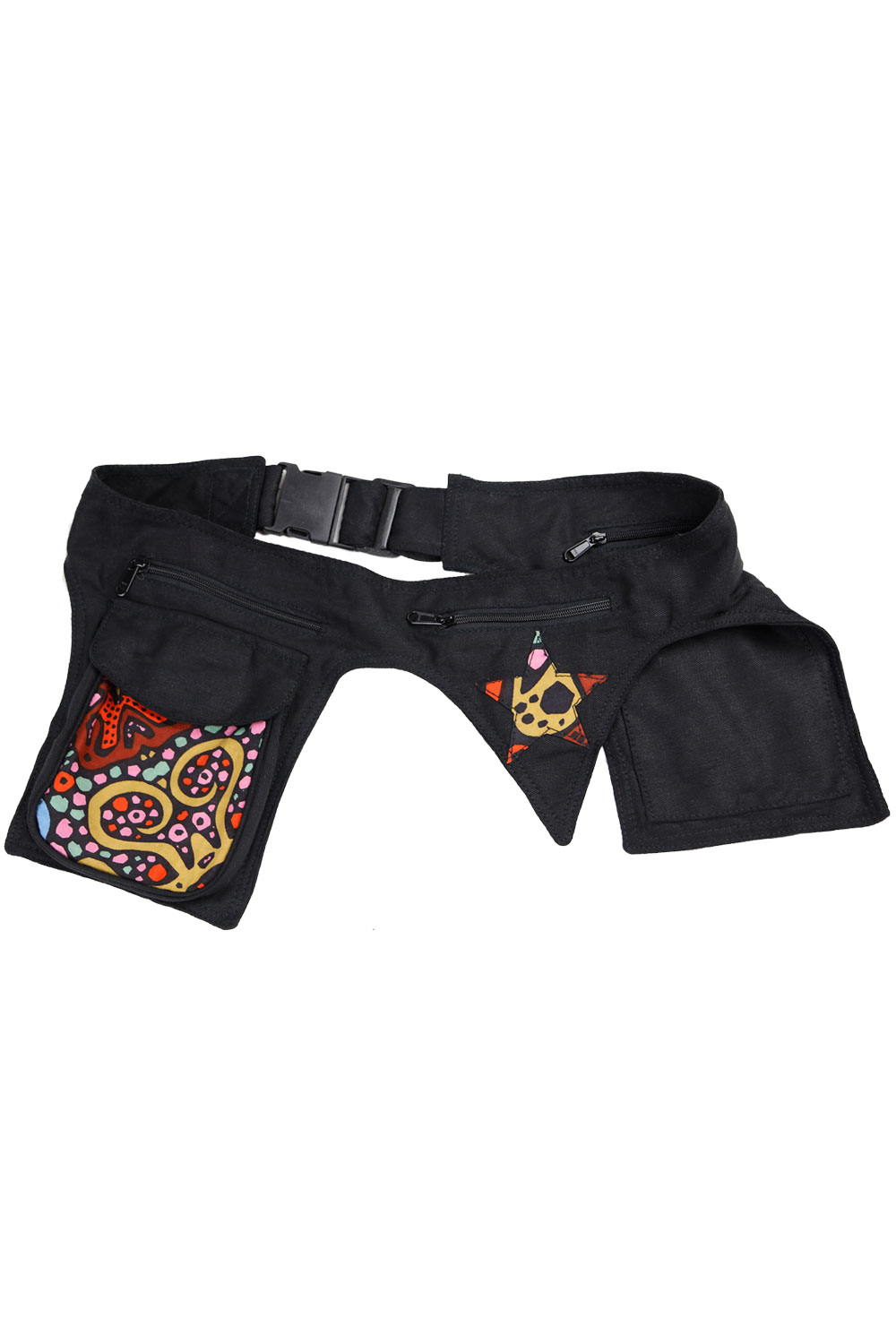 This belt bag is the mother of all belt bags.It features four outside pockets and three hidden inside pockets. It also includes a built-in bottle holder for easy beverage access. It has a sturdy plastic clip buckle and is fully adjustable to fit a wide range of waist sizes. This is the LARGE SIZE TO fit bigger waistlines. Stylish star patch on the back of the belt.Each belt bag is custom made. Fabric color and pattern varies from bag to bag.