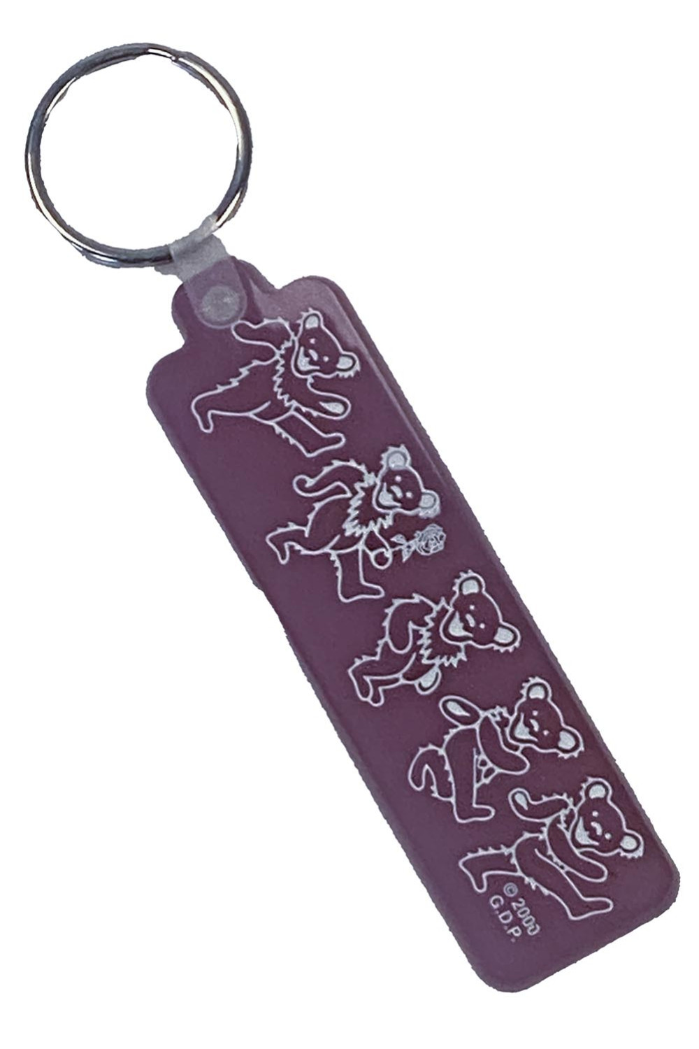 Vintage Grateful Dead Row Of Bears Keychain. purple with white graphics. Made of soft, durable rubber. Very lightweight and flexible. Measures 1" wide by 5" long (including key ring). Made by Grateful Graphics in 2000. These are no longer being produced and are only available while supplies last.