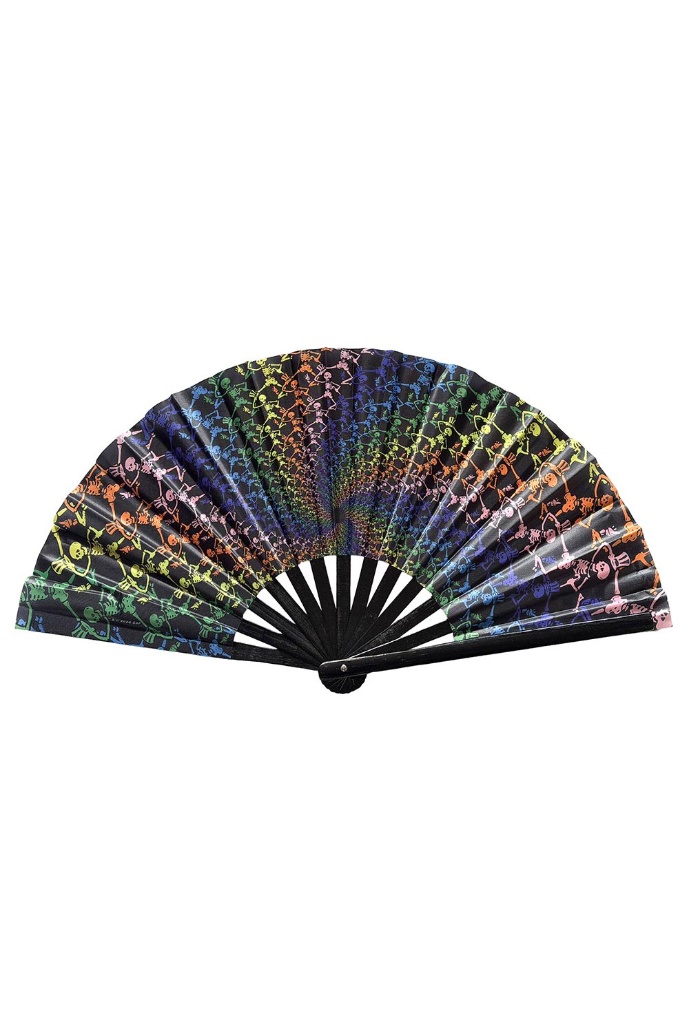 The Grateful Dead Top Hat Spiral Skeletons clacker dance fan brings classic Dead imagery together with hypnotic motion. Featuring dancing skeletons arranged in a swirling spiral, this folding fan delivers instant recognition and a visual rhythm that feels perfectly at home at live shows and festivals.
