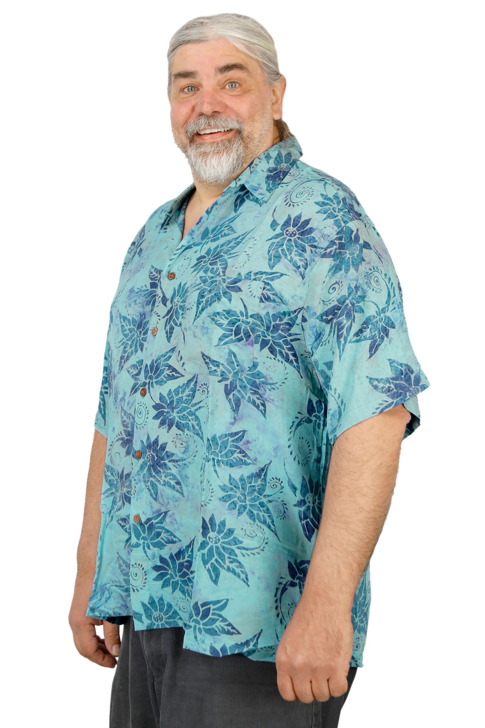 Hary Dary Men's Button Down Camp Shirt Aqua with Navy FlowersSuper soft, colorful and lightweight, these batik button down shirts are the perfect garment for the sun loving individual.Hary Dary is a leading name in batik clothing from Bali. Available in adult sizes medium through 2X. Made from 100% #1 Rayon. The highest quality rayon available. Made in Indonesia.