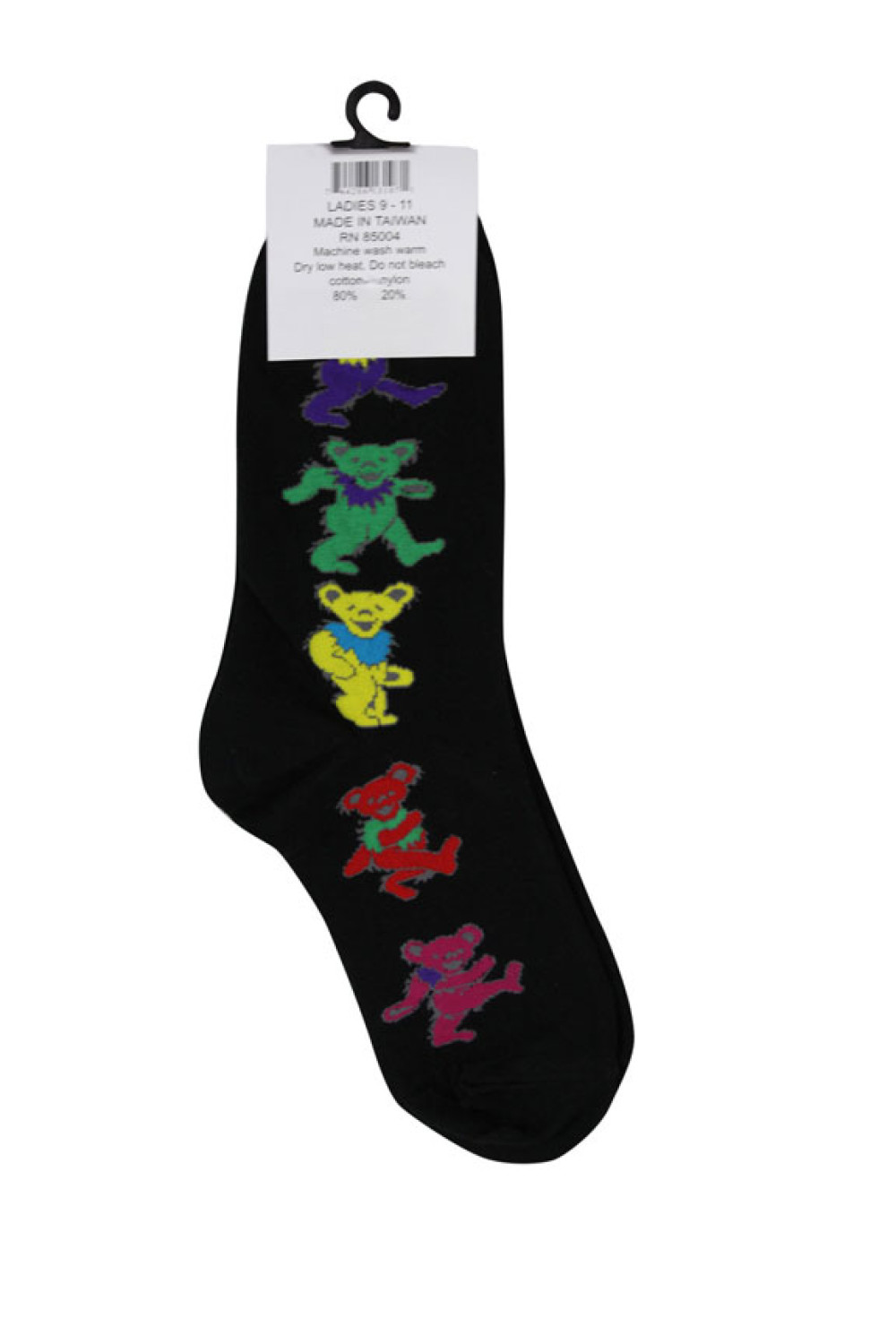 Ladies' Black Dancing Bear Grateful Dead Socks. As Owsley Stanley said for years, the bears are actually marching, not dancing. Either way, these socks will help you keep the rhythm and stay in step . 80% Cotton 20% Nylon Blend. Comes in one size.
