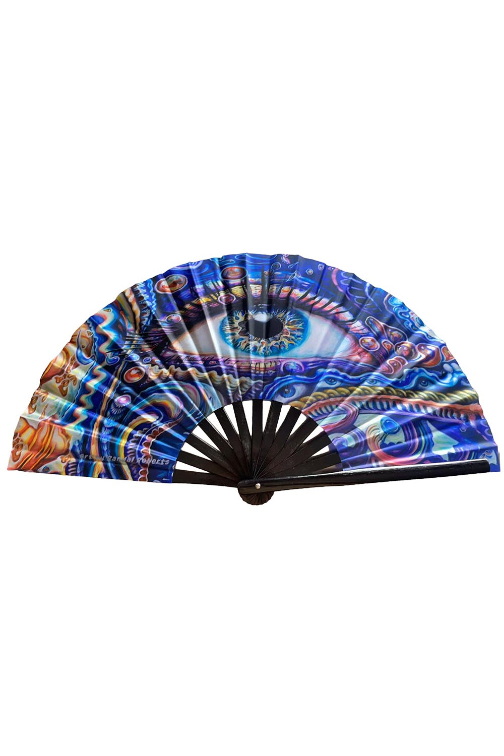 The Randal Roberts Blue Eye clacker dance fan is a striking fusion of visionary art and festival function. Featuring an intense, hypnotic eye surrounded by flowing, surreal patterns, this folding fan creates instant visual impact under stage lights, daylight, and night skies.