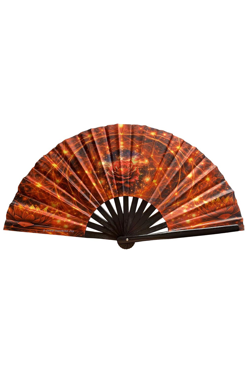 The Rose Root clacker dance fan is inspired by grounding energy, warmth, and connection. Featuring a glowing rose emerging from deep, radiant tones, this folding fan creates a powerful visual presence that feels rooted, steady, and alive in motion.