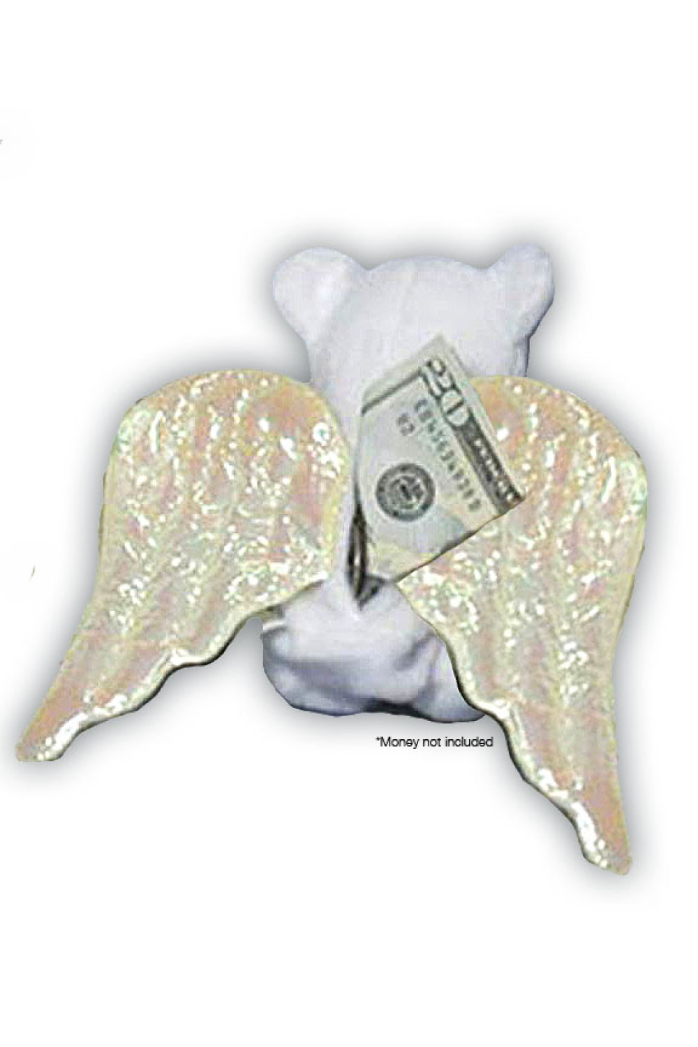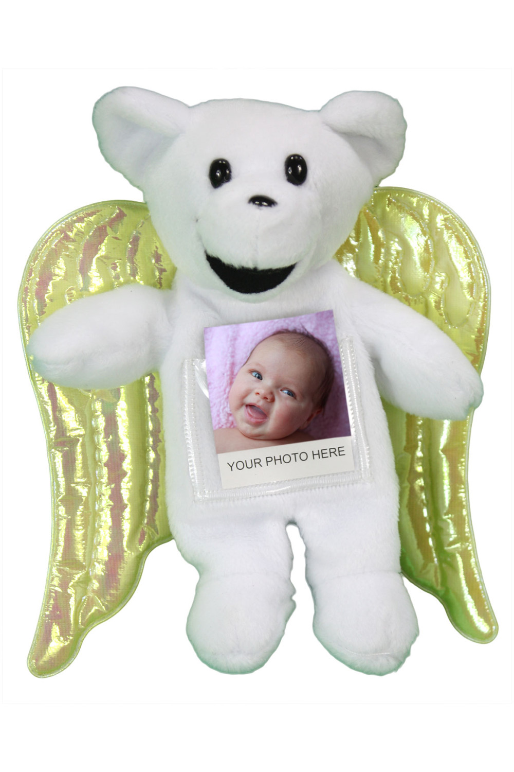 This super soft and cuddly stuffed angel bear comes with a plastic photo sleeve on its belly and a velcro-sealed stash pouch inside its back. Great for holding glass or herbs.