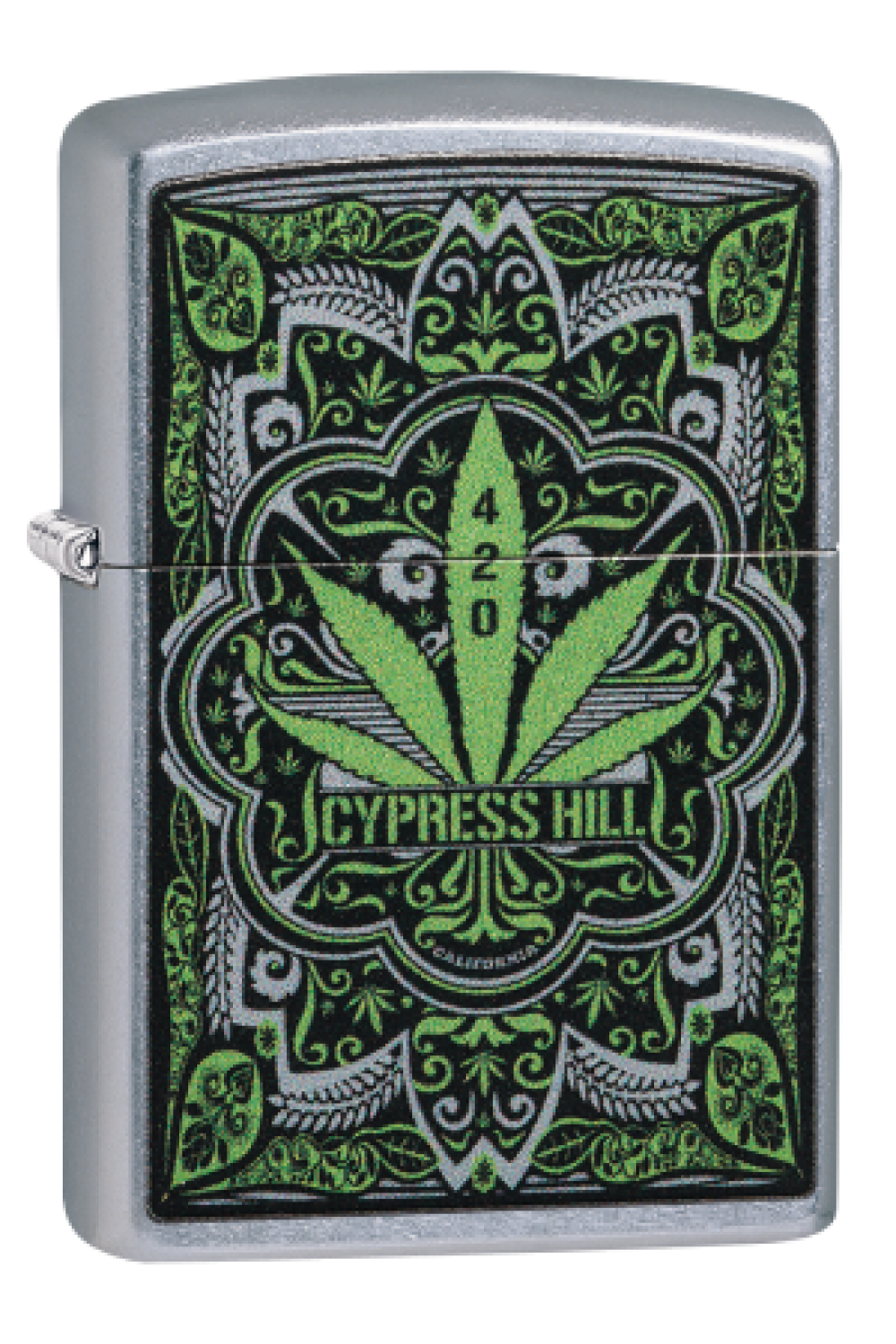 A perfect gift for any Cypress Hill fan. A filigree pattern surrounds the face of this Street Chrome™ lighter. Color imaged inside the pattern is the American hip hop group's logo. Comes packaged in a gift box. For optimal performance, fill with Zippo lighter fluid.